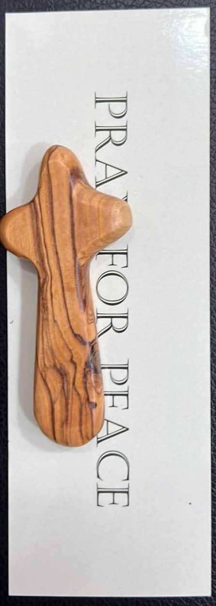 Handmade by artisans in Bethlehem, each cross is made from pruned olive wood. No two crosses are alike — each carries its own beautiful grain and warmth.